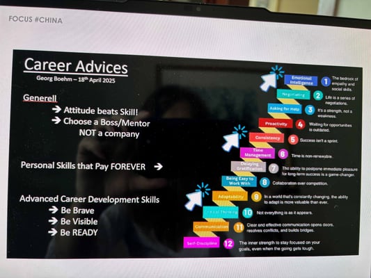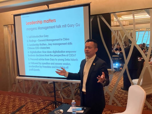 Im Abschluss-Referat erklärt uns Georg, ein deutscher Expat, der seit vielen Jahren mit einer Chinesin verheiratet ist, wie er seine internationale Karriere aufgebaut hat und wie Führung und Hierarchie in China gelebt werden. Er gibt den Teilnehmenden wertvolle Karrieren-Tipps mit auf den Weg.